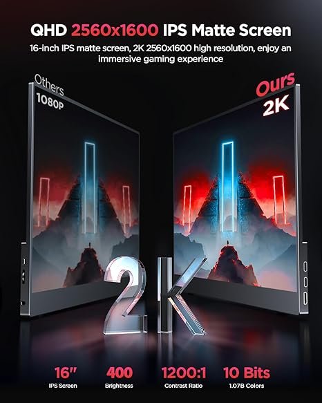 O monitor portátil UPERFECT de 16 polegadas é ideal para usuários que buscam alta qualidade de imagem, mobilidade e desempenho, tanto para jogos quanto para trabalhos gráficos e multimídia. Com resolução 2K Ultra HD e suporte à tecnologia HDR, ele entrega imagens nítidas, detalhadas e cores extremamente realistas, tornando cada cena, vídeo ou documento mais vívido. A tela IPS, cobrindo 100% da gama sRGB, garante consistência de cores e fidelidade visual mesmo em ângulos amplos, permitindo uma experiência imersiva e confortável.
