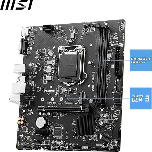 A MSI PRO H510M-B é uma placa-mãe compacta e acessível, ideal para quem busca um setup básico ou escritório. Com soquete LGA 1200, suporta processadores Intel 10ª e 11ª geração, garantindo desempenho suficiente para tarefas diárias, jogos leves e uso multitarefa moderado.