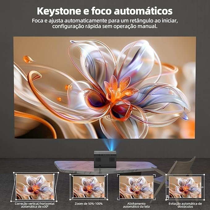 Função 180° giratório, ajuste Keystone automático, sistema Android embutido, suporte a aplicativos via WiFi e espelhamento de tela