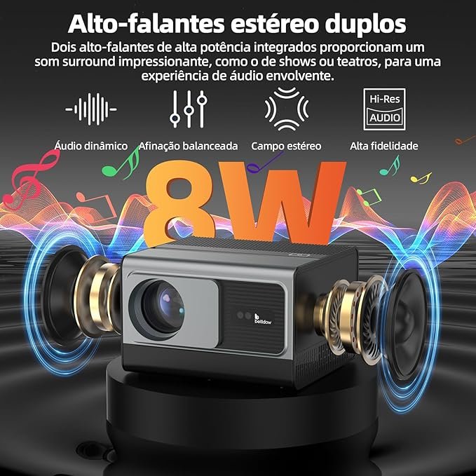 O áudio integrado, embora mais simples, é suficiente para uso casual, entregando som claro para filmes, apresentações e transmissões de vídeo. Sua instalação é prática, o que torna o Hy300 Pro ideal para quem deseja um projetor portátil e funcional, sem complicações ou equipamentos adicionais.